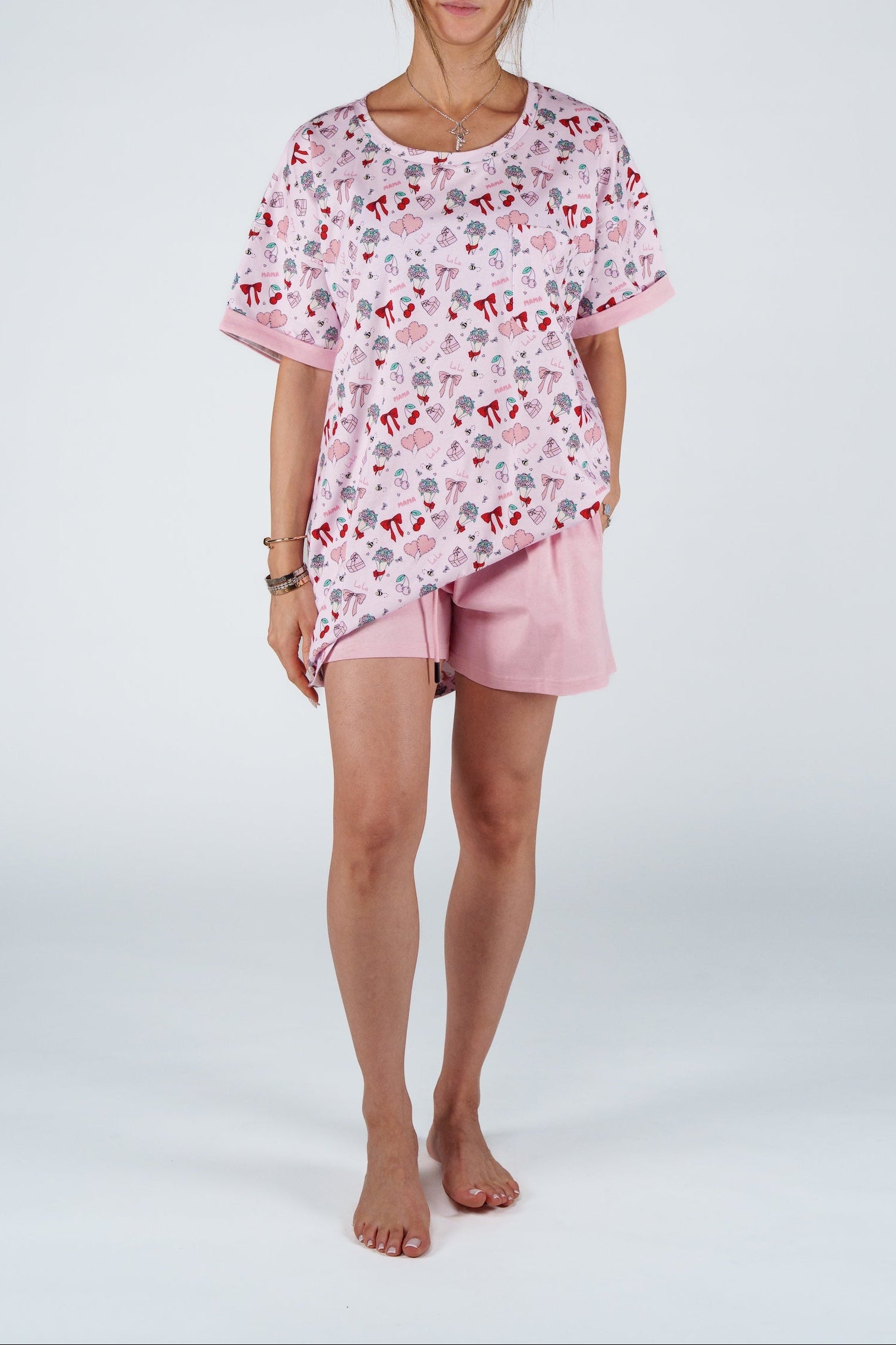 The Oversized Tee Set is all about effortless comfort and versatility. Designed with an oversized fit that's long enough to wear as a tee dress or paired with its matching shorts, it gives you two looks in one- perfect for lounging, sleeping, or relaxing through slow days at home. Soft, breathable, and easy to wear, its comfort made stylish.