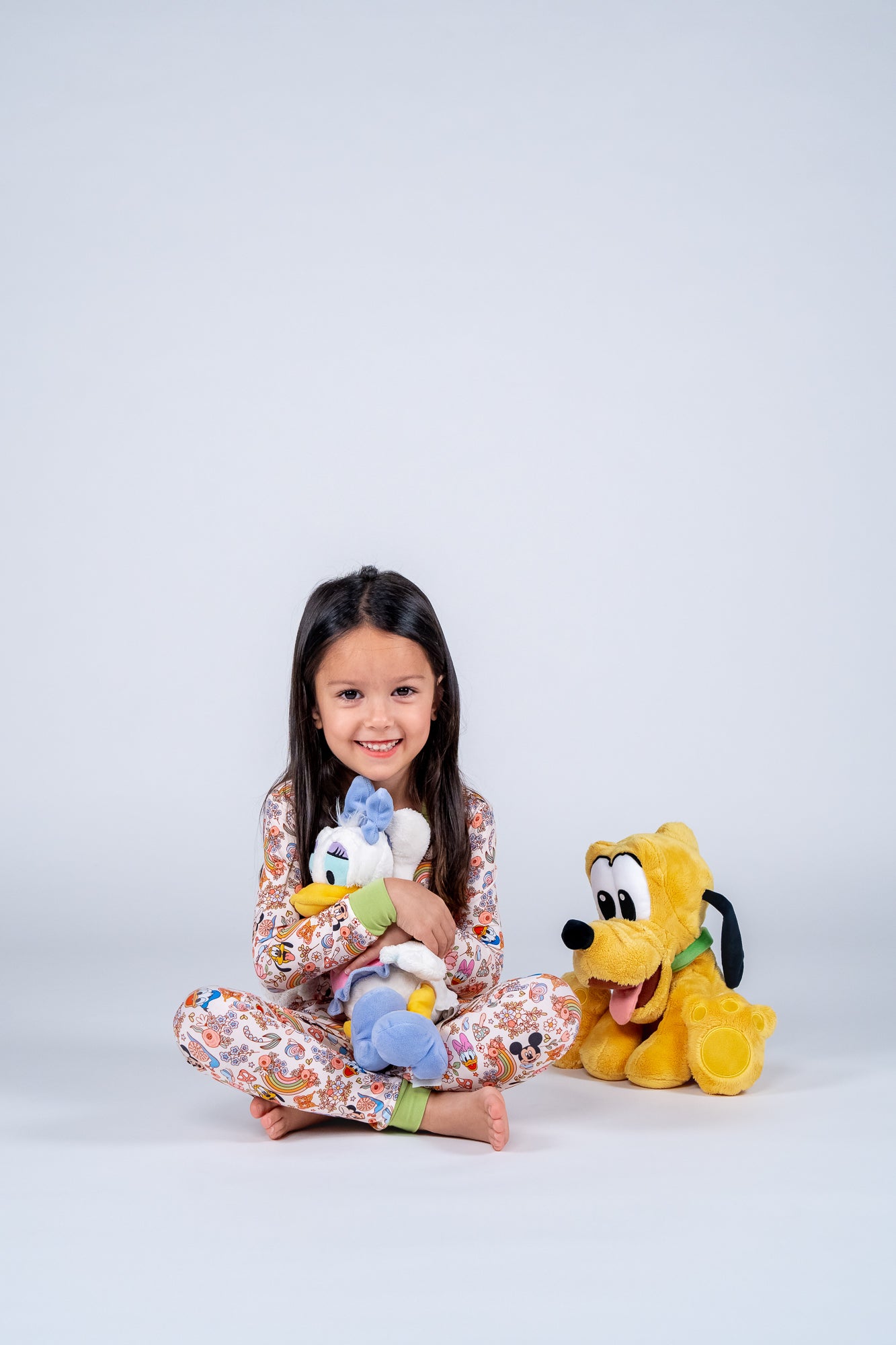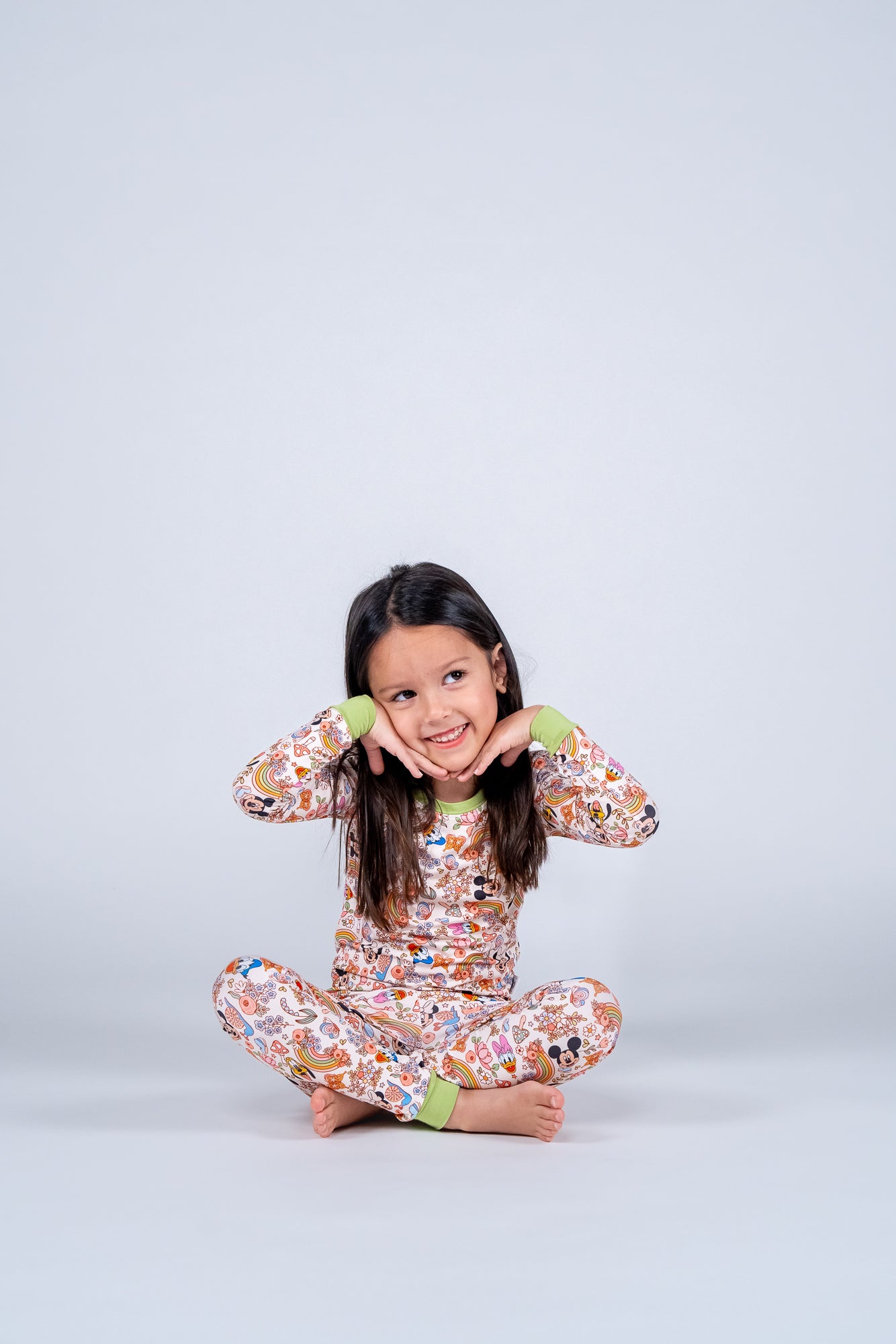Unleash the magic with our Daisy's Rainbow Dreams Jammies! Featuring Mickey, Minnie, and the gang, this romper bursts with vibrant flowers, rainbows, and butterflies. It's a festival of color and joy, wrapping your little one in a whimsical, hippie-inspired wonderland. Perfect for sparking smiles and adventures, this set is a dream come true!